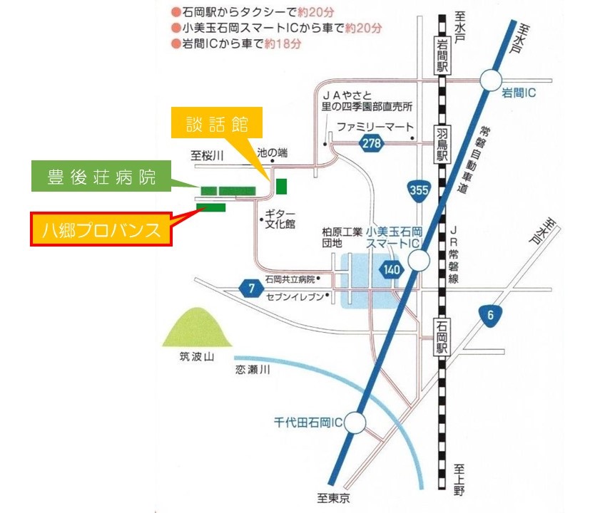 JR常磐線の羽鳥駅でお降りください。羽鳥駅の西側広場から、病院・各施設まで無料送迎バスをご利用下さい。